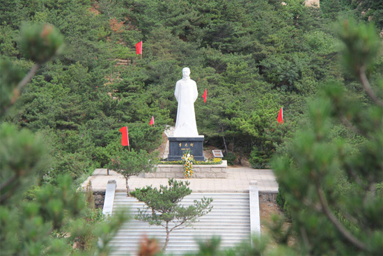 蒼松翠柏掩映下的大釗立像