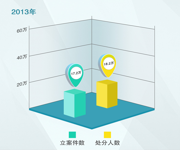 ????2013年,全國紀(jì)檢監(jiān)察機(jī)關(guān)共立案17.2萬件,處分18.2萬人。