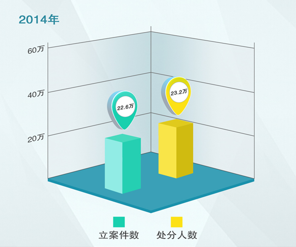 ????2014年,全國紀(jì)檢監(jiān)察機(jī)關(guān)共立案22.6萬件,處分23.2萬人。