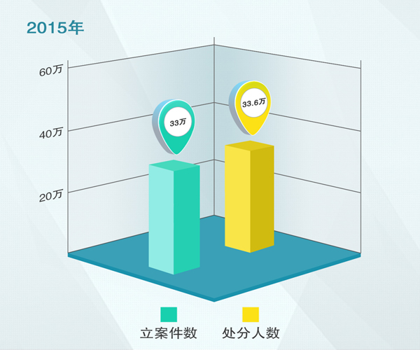 ????2015年,全國紀(jì)檢監(jiān)察機(jī)關(guān)共立案33萬件,處分33.6萬人。