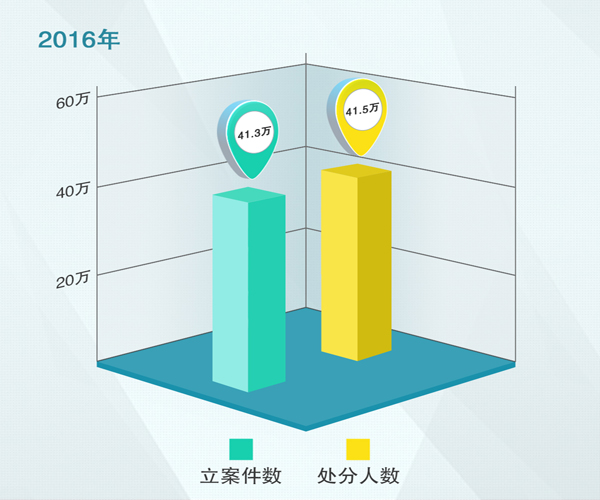 ????2016年,全國紀(jì)檢監(jiān)察機(jī)關(guān)共立案41.3萬件,處分41.5萬人。