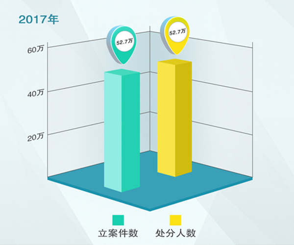 ????2017年,全國紀(jì)檢監(jiān)察機(jī)關(guān)共立案52.7萬件,處分52.7萬人。