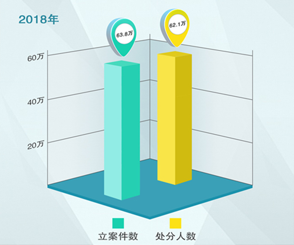 ????2018年,全國紀(jì)檢監(jiān)察機(jī)關(guān)共立案63.8萬件,處分62.1萬人(其中黨紀(jì)處分52.6萬人)。