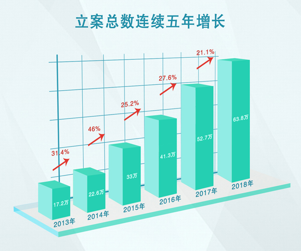 ????立案總數(shù)連續(xù)五年增長,年增長率分別為31.4%、46%、25.2%、27.6%、21.1%。2018年的立案件數(shù)比2013年增加46.6萬件。