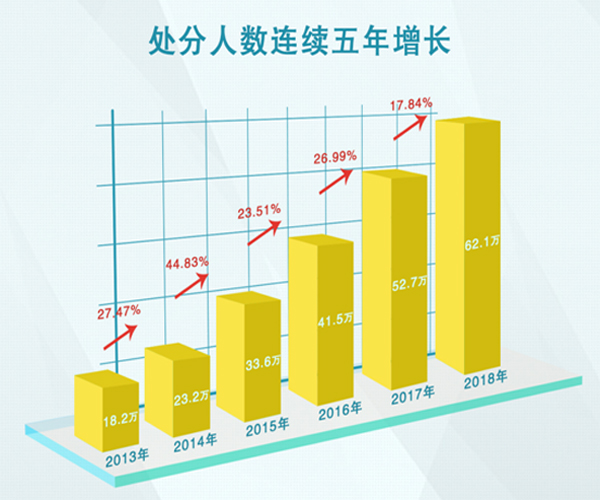 ????處分人數(shù)連續(xù)五年增長,年增長率分別為27.5%、44.8%、23.5%、27%、17.8%。2018年的處分人數(shù)比2013年增加43.9萬人。