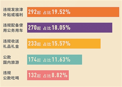????從違紀類型來看,違規發放津補貼或福利、違規配備使用公務用車、違規收送禮品禮金、公款國內旅游、違規公款吃喝等問題比重仍然較大,這5類問題占通報問題總數的73.6%。其中,違規發放津補貼或福利問題292起,占19.52%;違規配備使用公務用車問題270起,占18.05%;違規收送禮品禮金233起,占15.57%;公款國內旅游問題174起,占11.63%;違規公款吃喝問題132起,占8.82%。