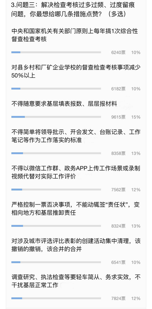 ????《通知》里針對的各種形式主義問題,哪些讓網友感受最深、最為痛恨?從上圖看出,各項問題得票率比較平均,而得票最高的是“督查檢查考核過多過頻、過度留痕”。點贊最多的一條留言來自網友“任先森”:“上面千把錘,下面一根釘,作為一名基層黨務工作者,上級檢查考核頻繁,各種臺賬報表浪費了大量的時間和精力,為了應付檢查,絞盡腦汁編材料做記錄,為了學習而學習,為了記錄而記錄,給基層工作人員帶來極大的負擔。”很多網友留言抱怨,重復制作臺賬、在app上打卡、拍照錄視頻等各種過度“留痕”工作,占用了基層干部大量時間精力,令人煩不勝煩。