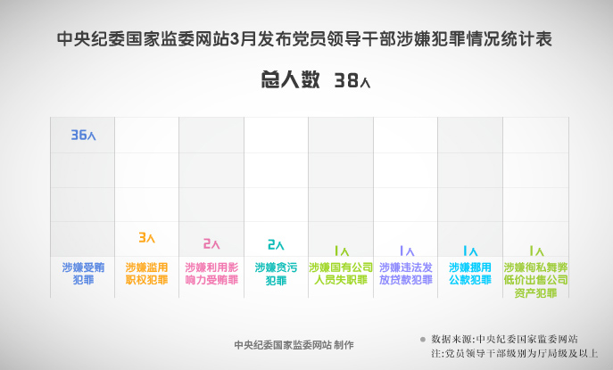 根據2025年3月中央紀委國家監委網站發布的38條黨紀政務處分信息,涉嫌受賄犯罪的黨員領導干部人數達36人。其他涉嫌犯罪情況包括:涉嫌貪污犯罪、涉嫌利用影響力受賄罪、涉嫌國有公司人員失職罪、涉嫌違法發放貸款犯罪、涉嫌濫用職權犯罪和涉嫌徇私舞弊低價出售公司資產犯罪。