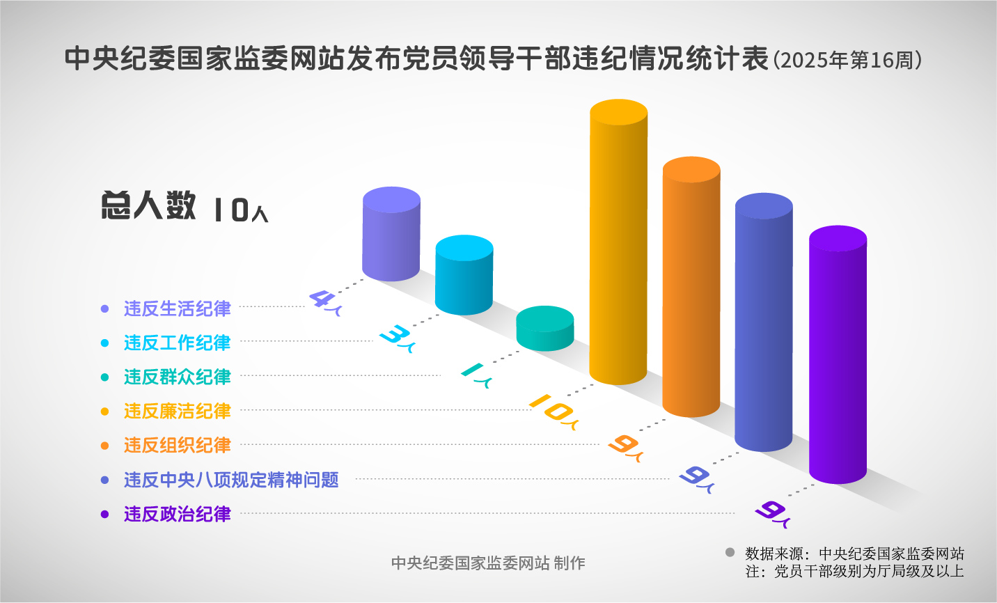 2025年第16周,中央紀委國家監委網站發布的黨紀政務處分信息中,10名被處分黨員領導干部均存在違反廉潔紀律問題,有9人存在違反政治紀律、組織紀律、中央八項規定精神問題。1人違反群眾紀律,3人違反工作紀律,4人違反生活紀律。