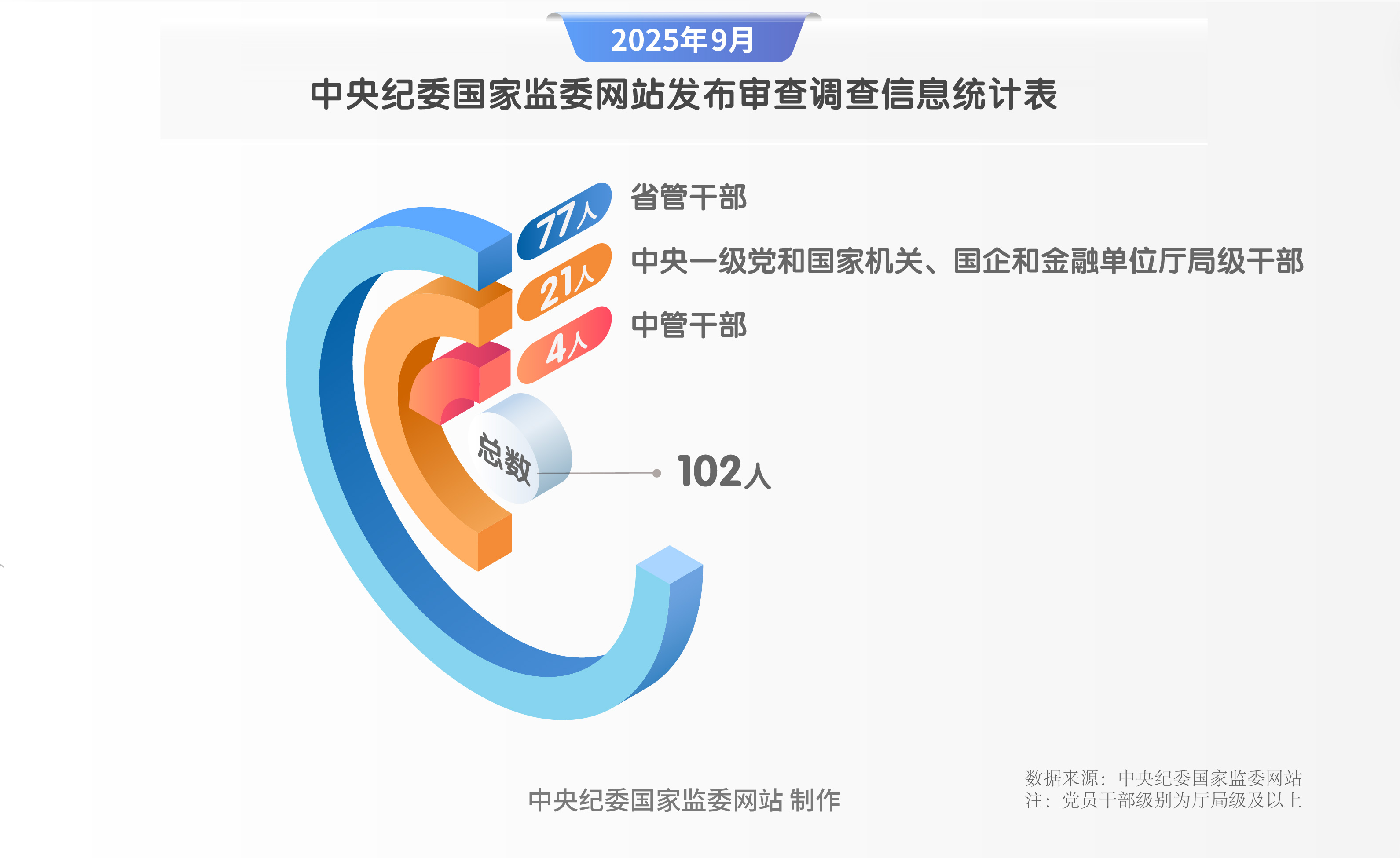 2025年9月,中央紀(jì)委國家監(jiān)委網(wǎng)站共發(fā)布102名黨員、干部接受審查調(diào)查信息。其中,中管干部4名,中央一級黨和國家機關(guān)、國企和金融單位廳局級干部21名,省管干部77名。