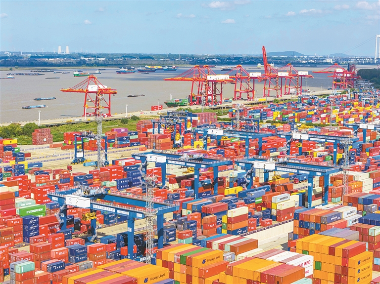 由經濟大國向經濟強國轉變,內外循環相互促進、相得益彰,正共同繪就中國經濟高質量發展的壯美畫卷。圖為近日,作業繁忙的江蘇省港口集團南京港龍潭港區。 圖片來源:視覺中國