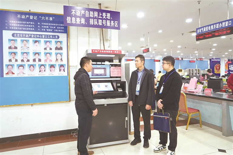 廣西壯族自治區北流市紀委監委緊盯群眾反映強烈的不動產“登記難”問題,通過約談提醒、發放提示函等方式,推動自然資源、住建、財政、稅務等部門成立工作組,打通不動產登記工作中的堵點。圖為近日,該市紀檢監察干部在市不動產登記中心了解有關情況。 李家輝 攝