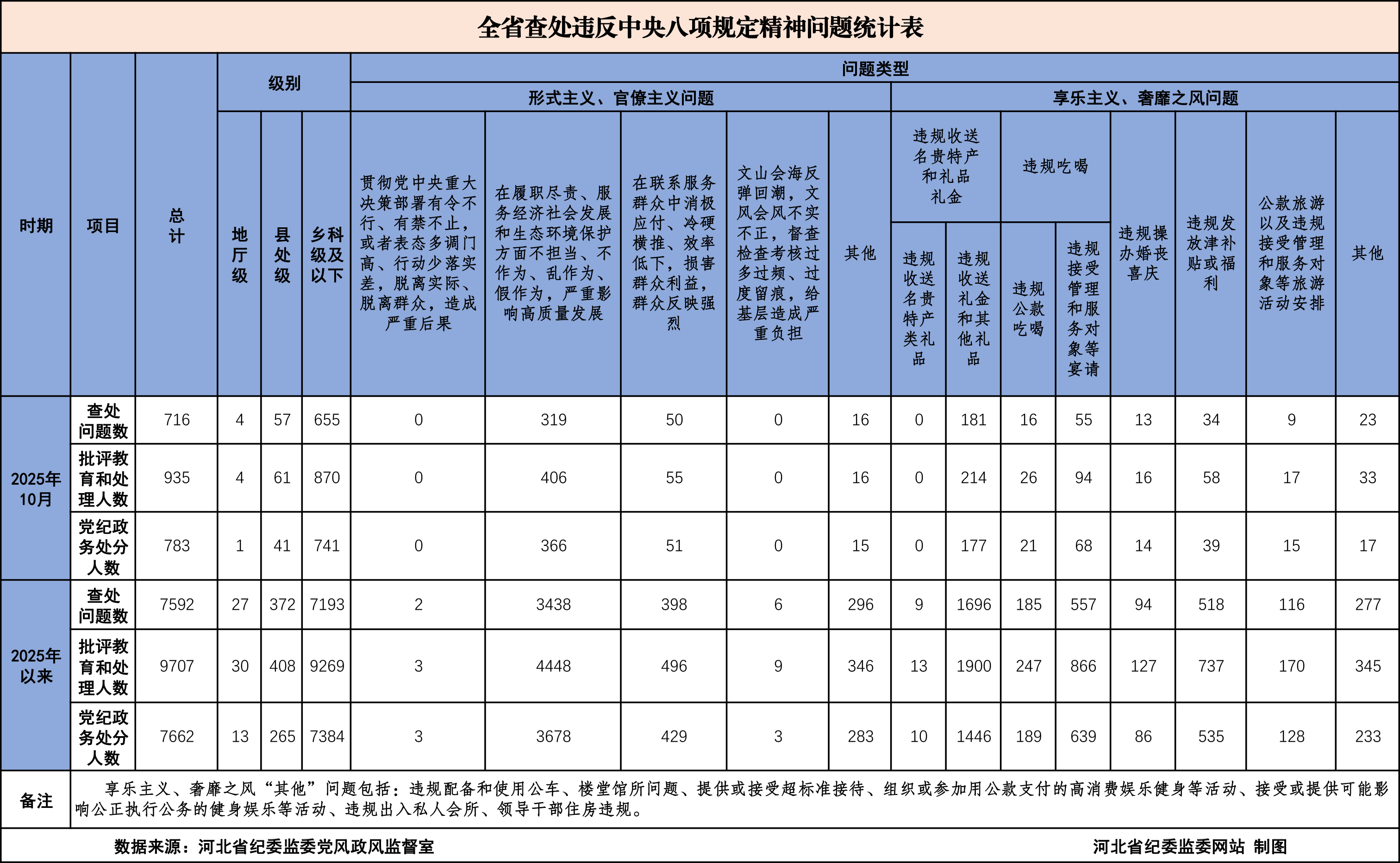 今年10月,全省共查處違反中央八項規定精神問題716起,批評教育和處理935人,其中黨紀政務處分783人。